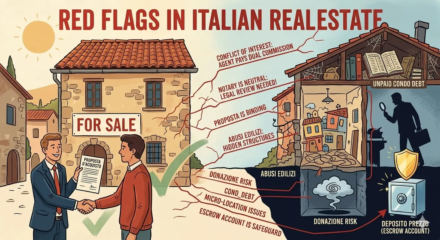 In Italy, the real estate agent acts as a mediatore (mediator), not as your exclusive representative. They legally collect a commission from both the buyer and the seller, which creates an inherent conflict of interest. Their primary incentive is to close the deal — not to protect your investment.